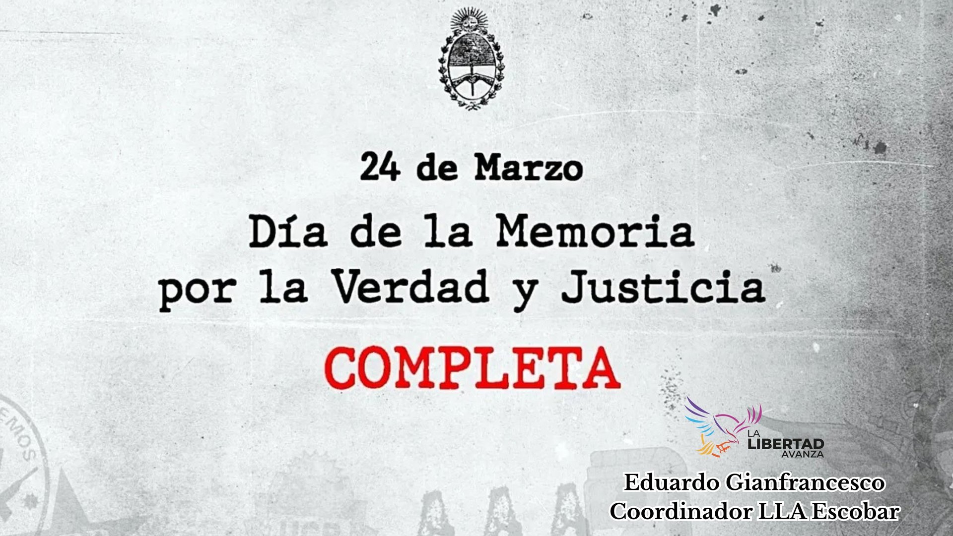 La Libertad Avanza (LLA) Escobar, liderada por el coordinador y jefe de bloque de concejales, Eduardo Gianfrancesco, publicó un comunicado sobre el 24 de Marzo en el que reclamó que exista una "memoria completa" con "todas las víctimas", tanto del Gobierno militar como de las organizaciones terroristas de izquierda, por lo ocurrido durante los '70.