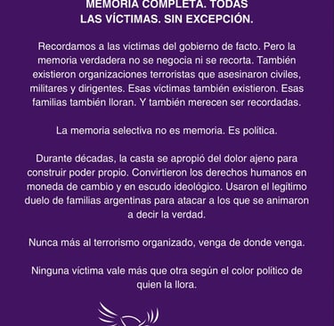 Recordamos a las víctimas del gobierno de facto. Pero la memoria verdadera no se negocia ni se recorta. También existieron organizaciones terroristas que asesinaron civiles, militares y dirigentes. Esas víctimas también existieron. Esas familias también lloran. Y también merecen ser recordadas.