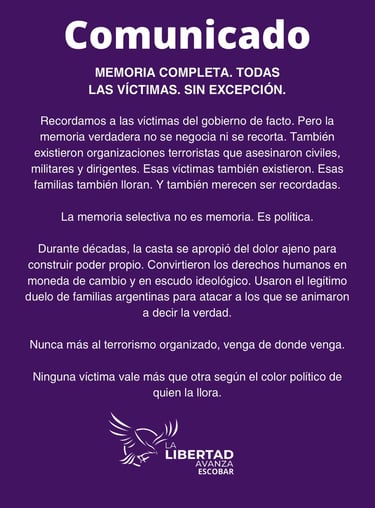 "Recordamos a las víctimas del gobierno de facto. Pero la memoria verdadera no se negocia ni se recorta", empezó el escrito publicado a través de Instagram. En otro tramo, explicaron que "la memoria selectiva no es memoria, es política" y que durante décadas, "la casta convirtió los derechos humanos en moneda de cambio y en escudo ideológico".